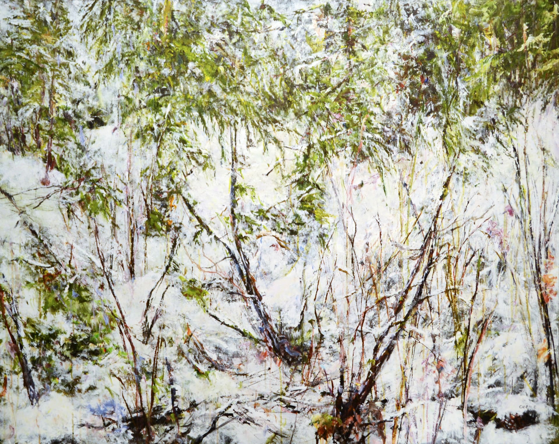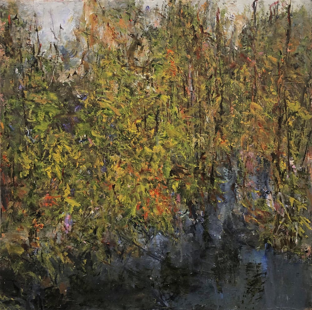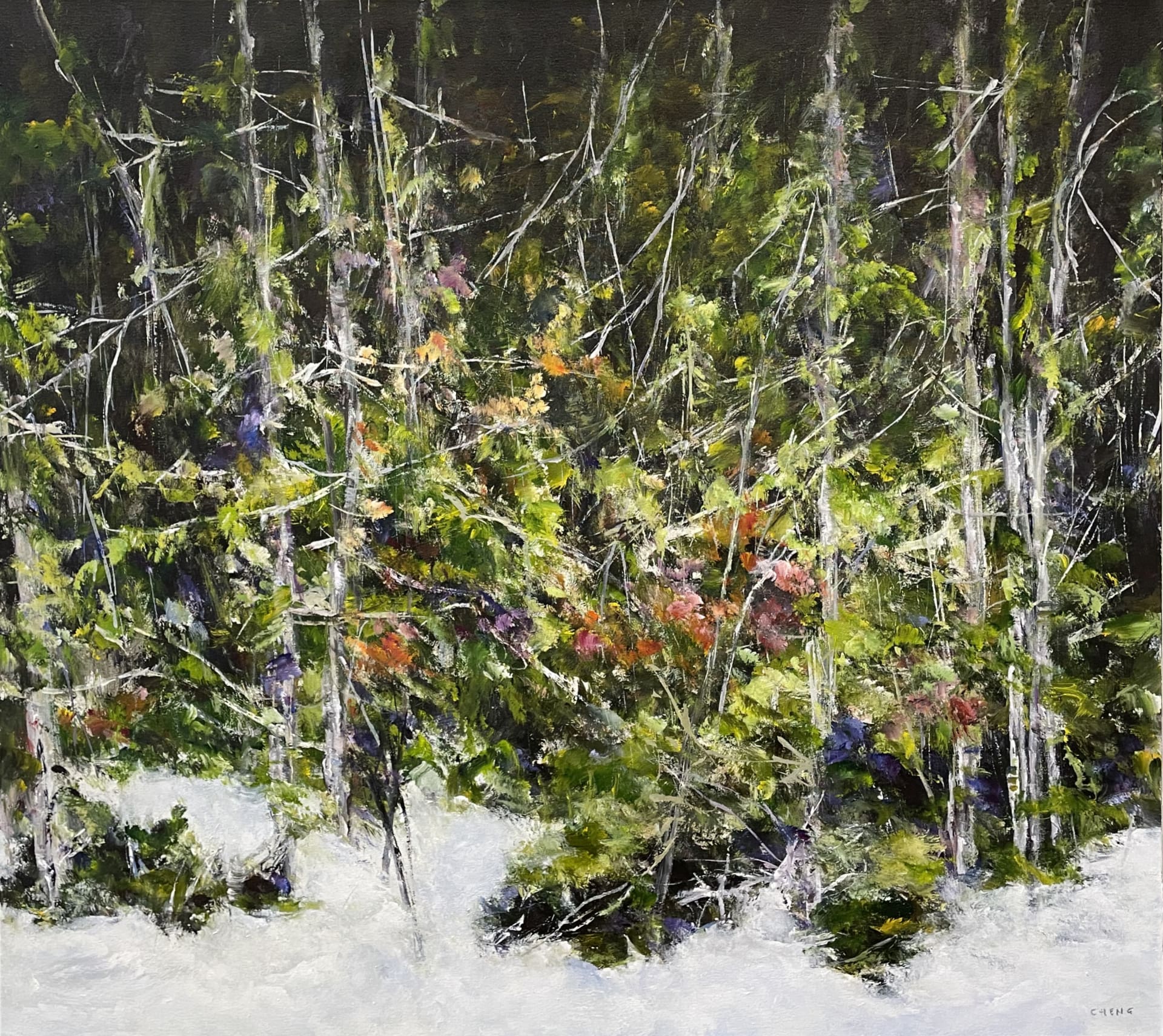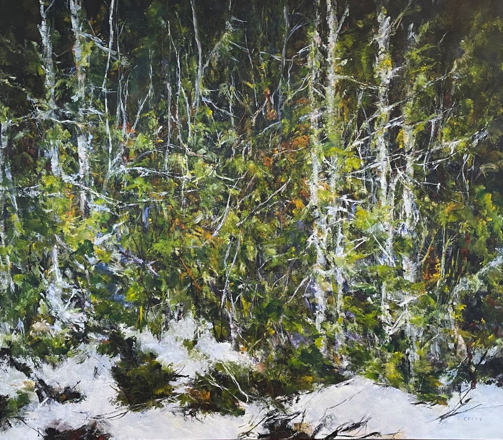 Judy Cheng’s paintings are, in a sense, the antithesis to prevailing notions of landscape painting. She doesn’t depict rolling hills, grand vistas, peaks and clouds, rather, she offers a study of what the landscape is really composed of. Under the tutelage of her close friend, legendary Vancouver artist Gordon Smith, Judy’s evocative, energetic pictures point their gaze downwards and straight ahead into the thickets. As she wrestles with the raw canvas, everything is brought directly to the front of the picture plane while pockets of space and depth are discovered and carved out of the composition. The branches, bushes, dirt, sticks, snow, leaves, and flowers jostle for position, crafting a dense, rhythmic mosaic.