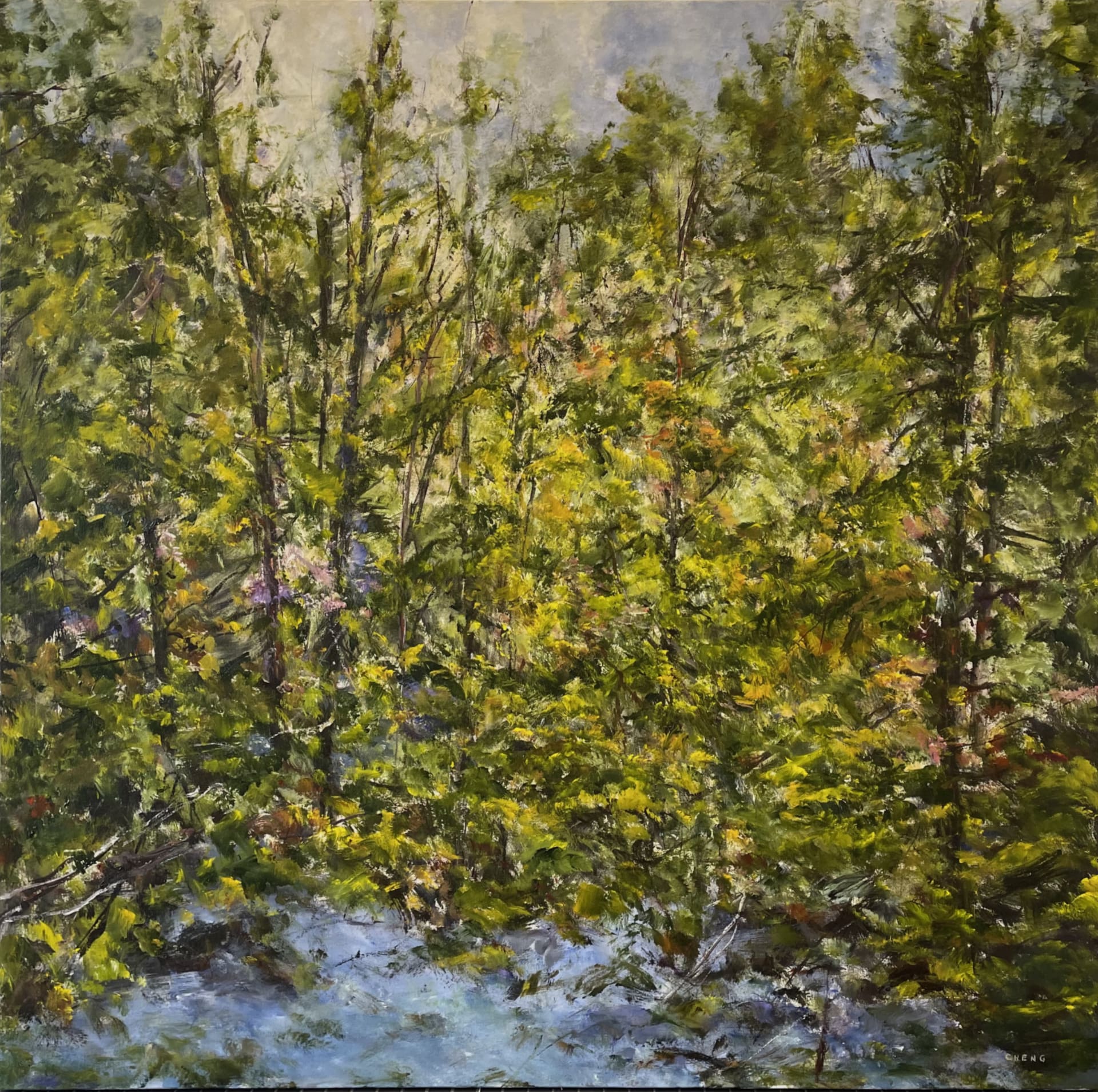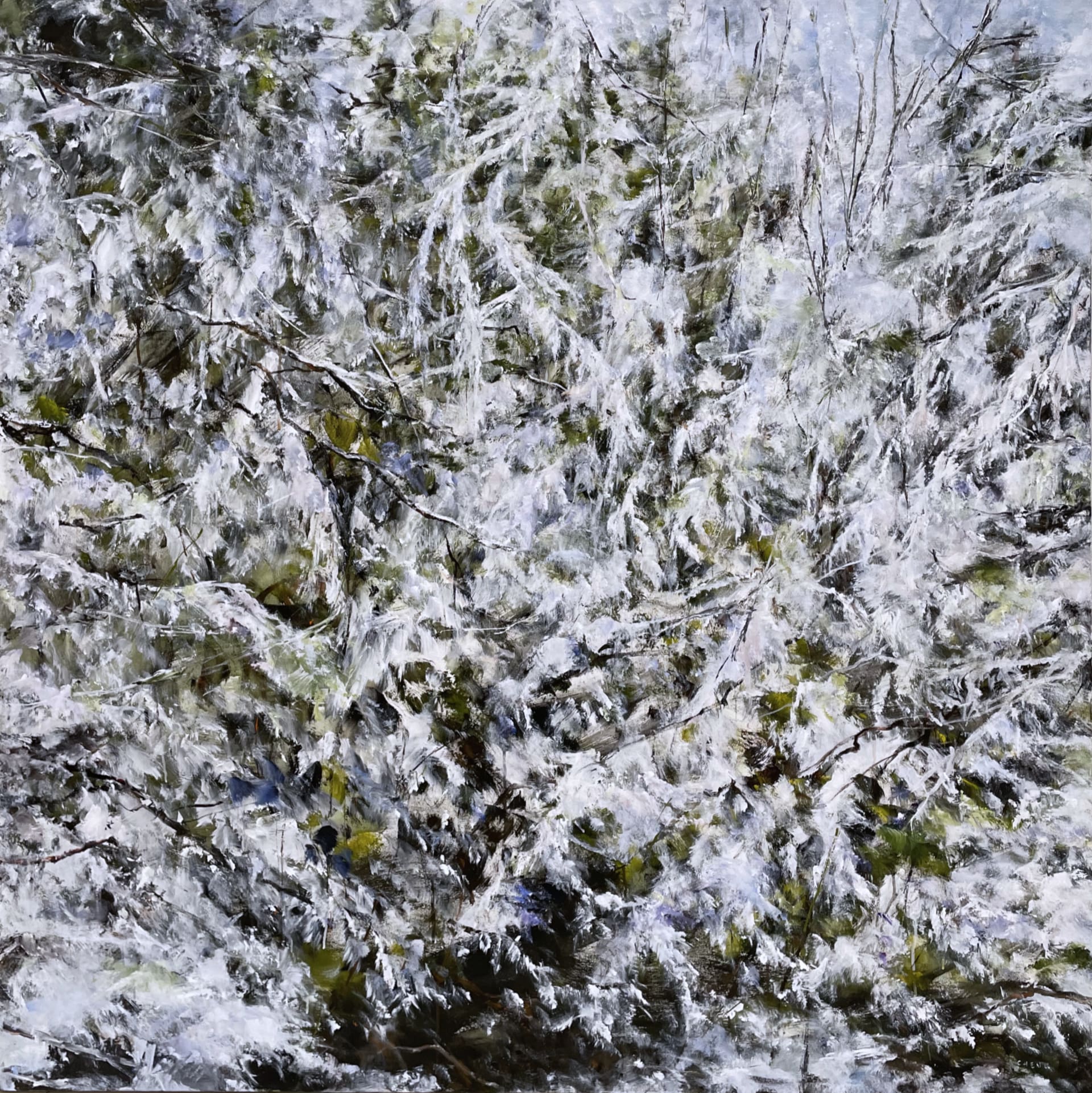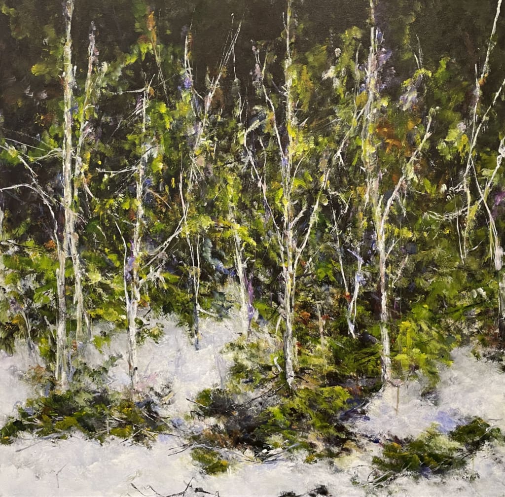 Judy Cheng’s paintings are, in a sense, the antithesis to prevailing notions of landscape painting. She doesn’t depict rolling hills, grand vistas, peaks and clouds, rather, she offers a study of what the landscape is really composed of. Under the tutelage of her close friend, legendary Vancouver artist Gordon Smith, Judy’s evocative, energetic pictures point their gaze downwards and straight ahead into the thickets. As she wrestles with the raw canvas, everything is brought directly to the front of the picture plane while pockets of space and depth are discovered and carved out of the composition. The branches, bushes, dirt, sticks, snow, leaves, and flowers jostle for position, crafting a dense, rhythmic mosaic.