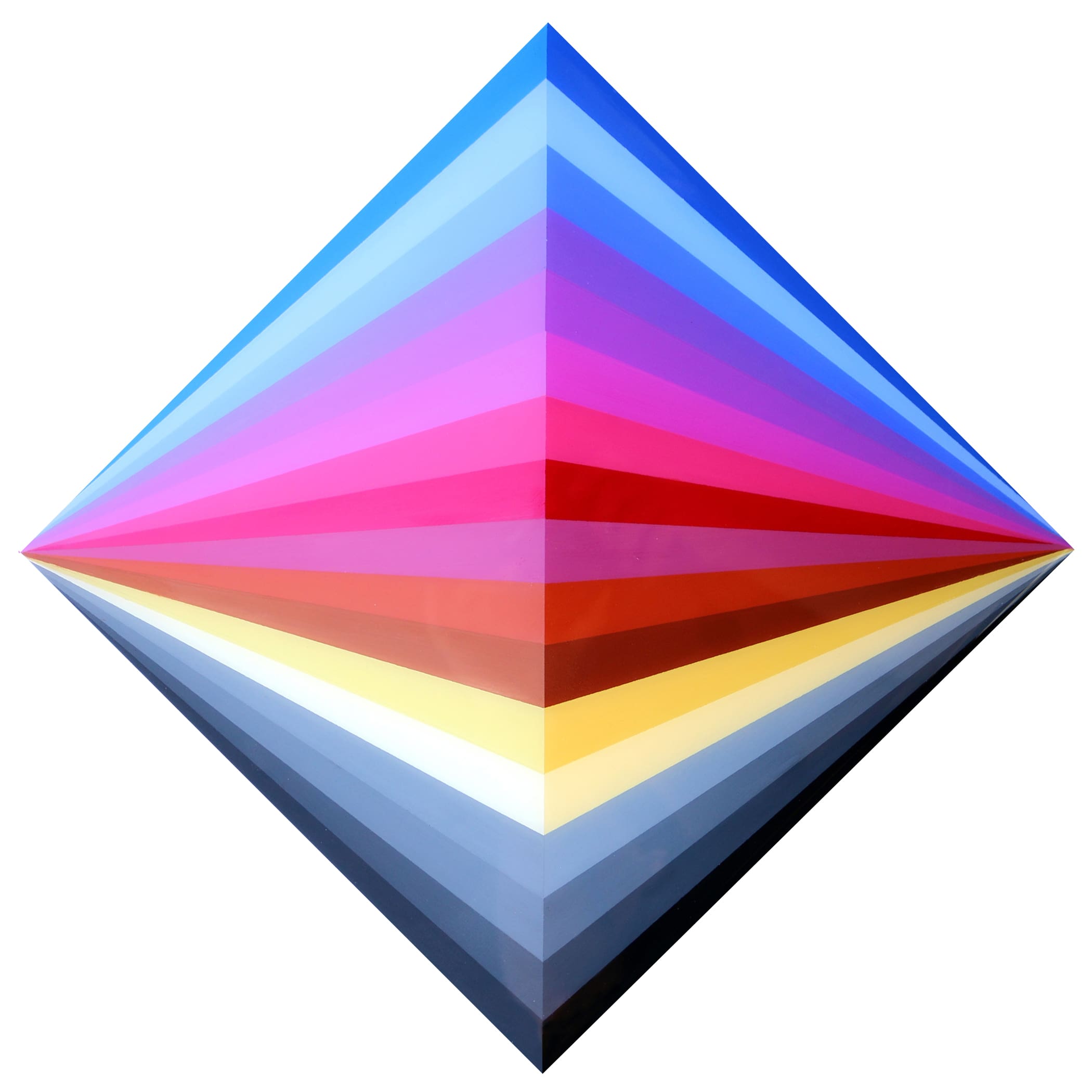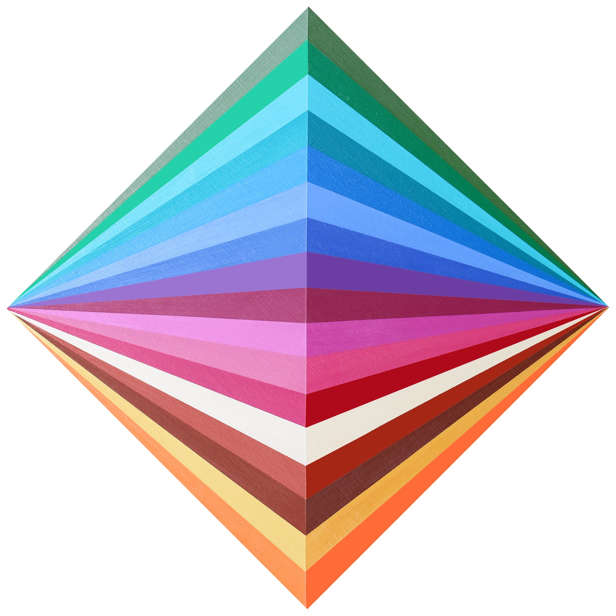 The spectrums Dean features in his painting are largely informed by the purity and saturation of light refractions passing through various glass, gemstones and other translucent substances. He captures the ethereal qualities of luminescence and translates it to physical and bold paintings using the hard-edge style.