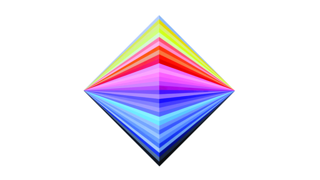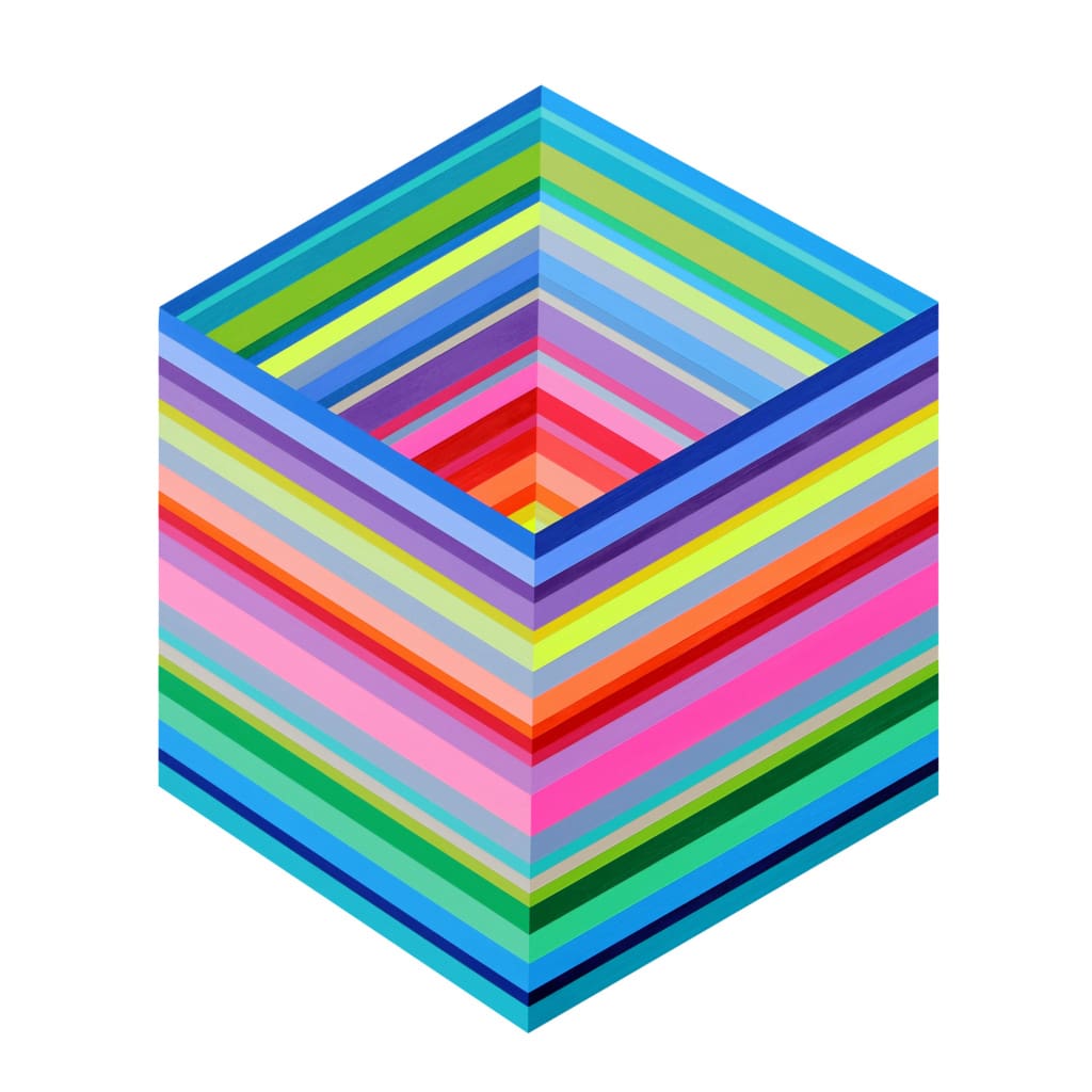 With a focus on geometric abstraction, Dean’s illusionistic paintings celebrates a joyous full spectrum of colour. Colour acts as a focal point; each bold line and juxtaposing mark are saturated with rich hues, creating a vibrating language of harmony and dissonance between tones. From afar, Dean’s paintings appear as 3-D objects, challenging the viewer’s perspective and visual space. At proximity, it is a chromatic boost that uplifts and energizes the senses.