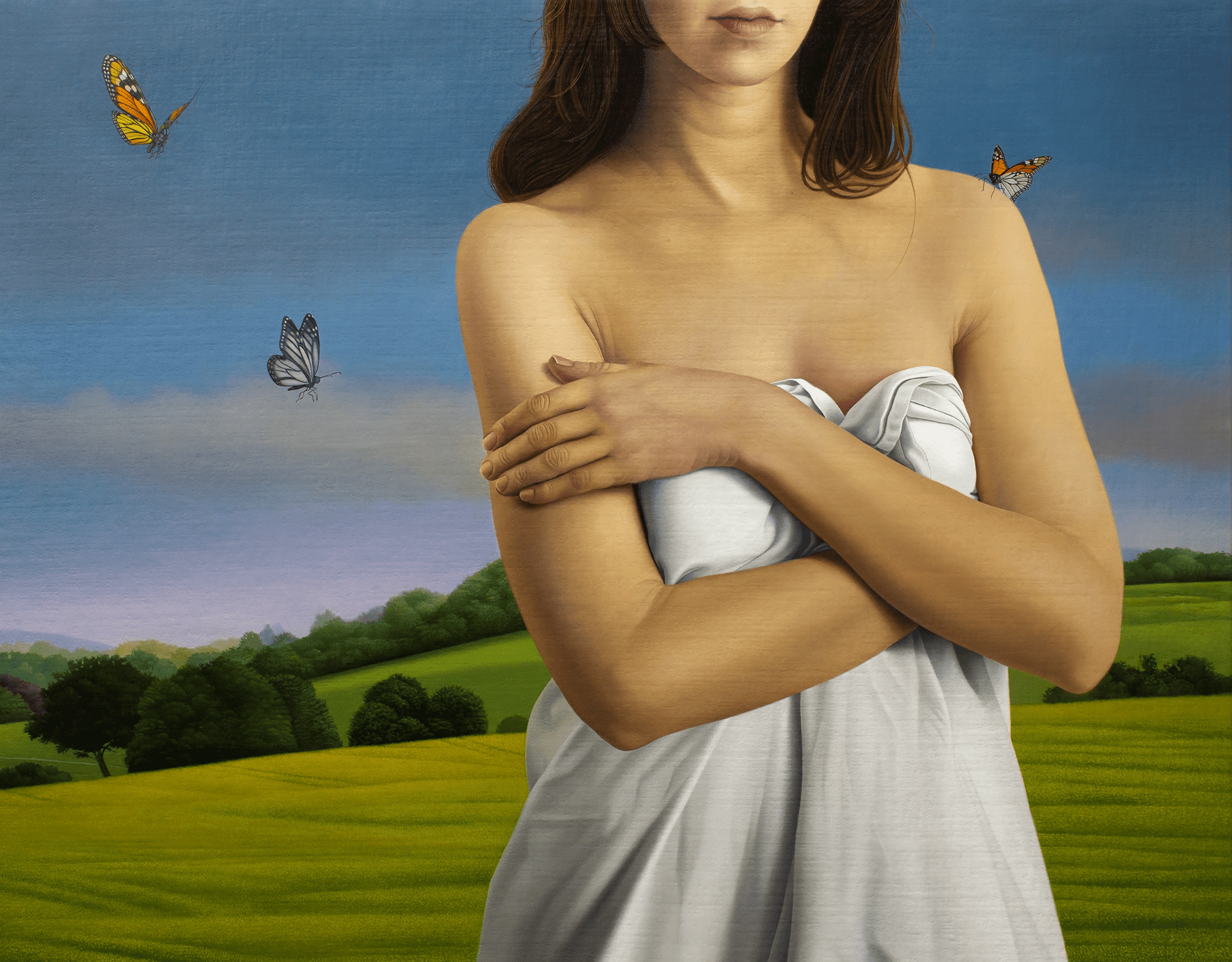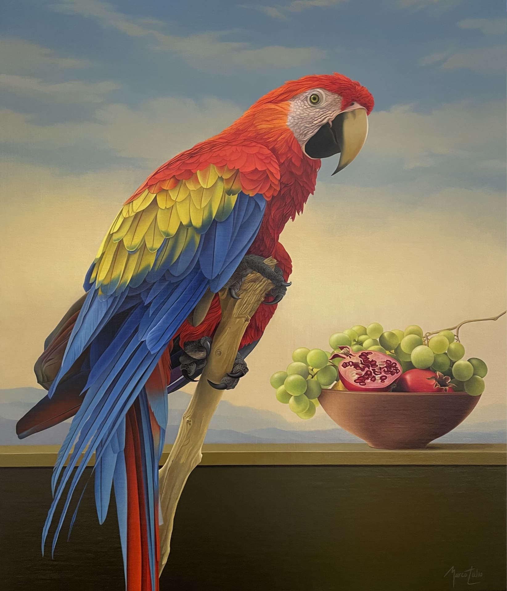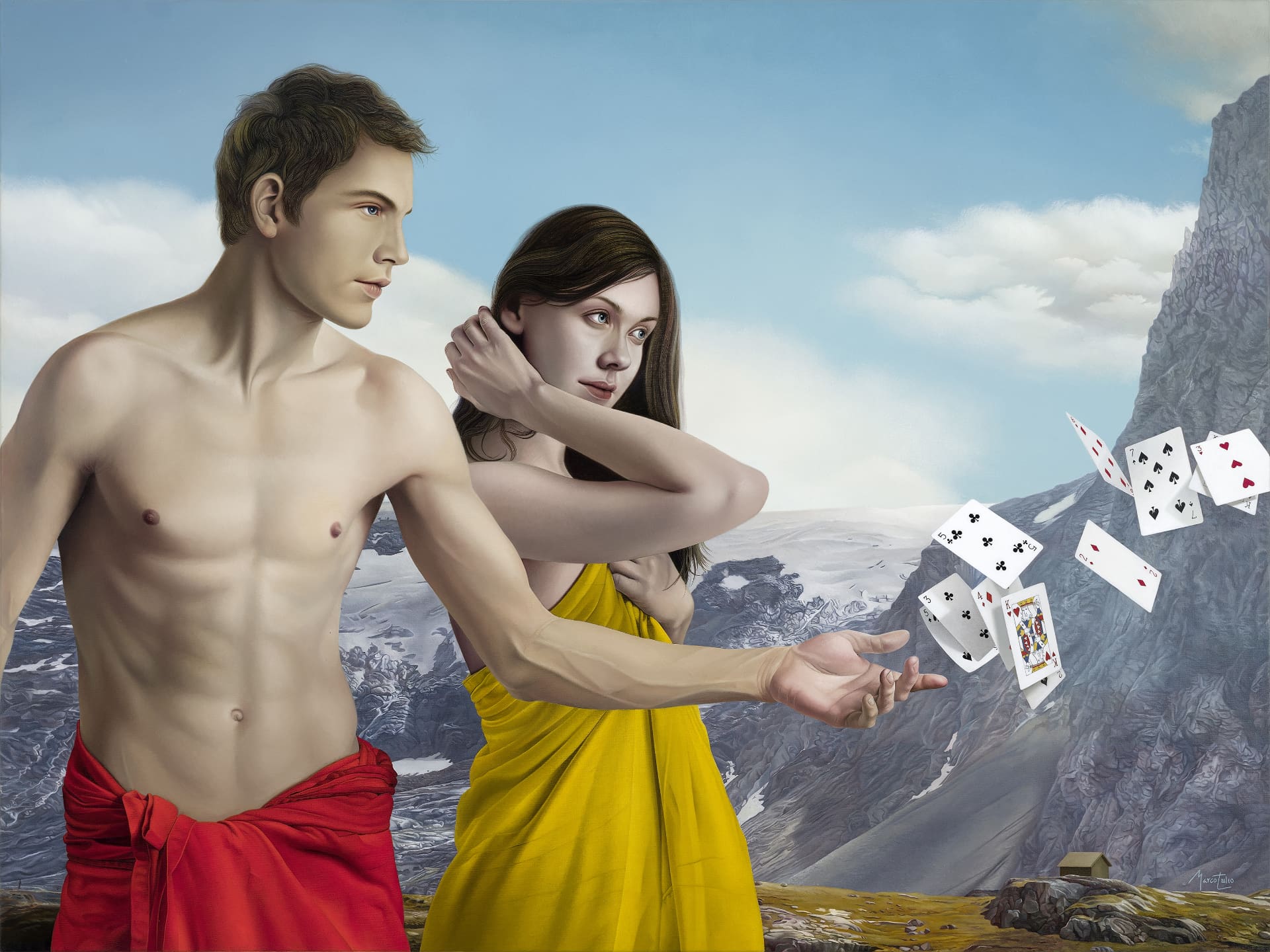 Tulio’s paintings are like confrontational history tableaus – luxury objects faithfully depicting a romanticized idea of “Western” culture whose enduring historical dominance and complex influence persist. His images are both an homage to and subtle critique of this past, a narrative largely transmitted via art history. This topography of forms is mined and subverted through a contemporary collision of imagery both beautiful and haunting, descriptive and playful, allegorical and historical. Tulio takes the dual bedrocks of Western civilization, Christianity and Greek culture, inverting and making them surreal, as if Magritte, De Chirico and Dali were mashed up against Michelangelo, medieval Dutch landscape and Hellenistic figuration.